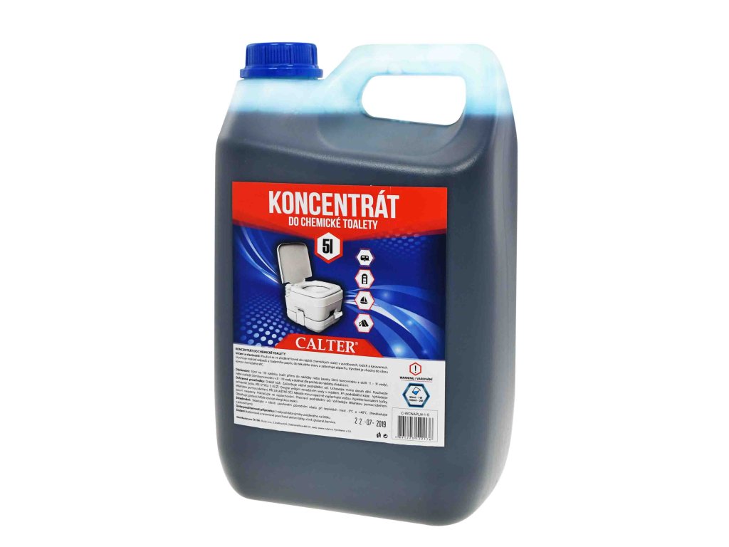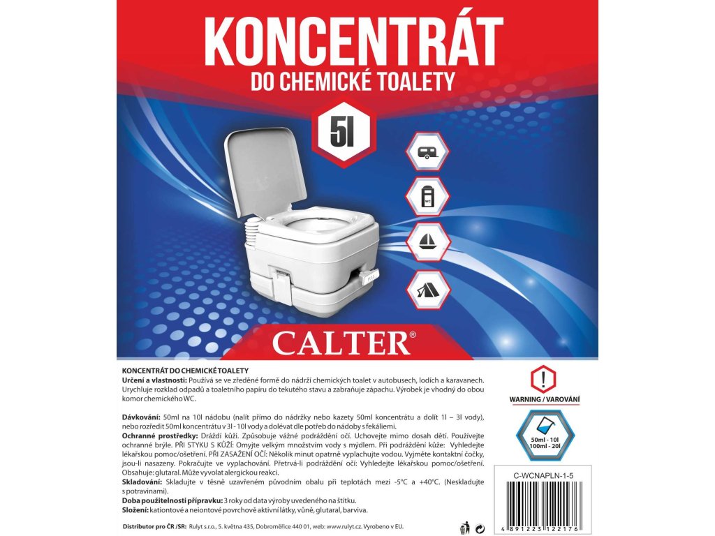 CALTER KONCENTRAT DO TOALET CHEMICZNYCH 5L - wypełnienie do toalet chemicznych (zbiornik na śmieci) Właściwości: Stosowany w postaci rozcieńczonej do zbiorników toalet chemicznych, gdzie przyspiesza rozkład odpadów i papieru toaletowego. Jednocześnie pomaga usunąć nieprzyjemne zapachy i gazy powstające w procesach rozkładu. Produkt nadaje się do obu komór toalety chemicznej. Dawkowanie: 50ml na opakowanie 10L (50ml koncentratu wlać bezpośrednio do zbiornika lub wkładu i uzupełnić 1l - 3l wody) lub rozcieńczyć 50ml koncentratu w 3l - 10l wody i uzupełnić w miarę potrzeby do pojemnika z kałem.Parametry dodatkowe