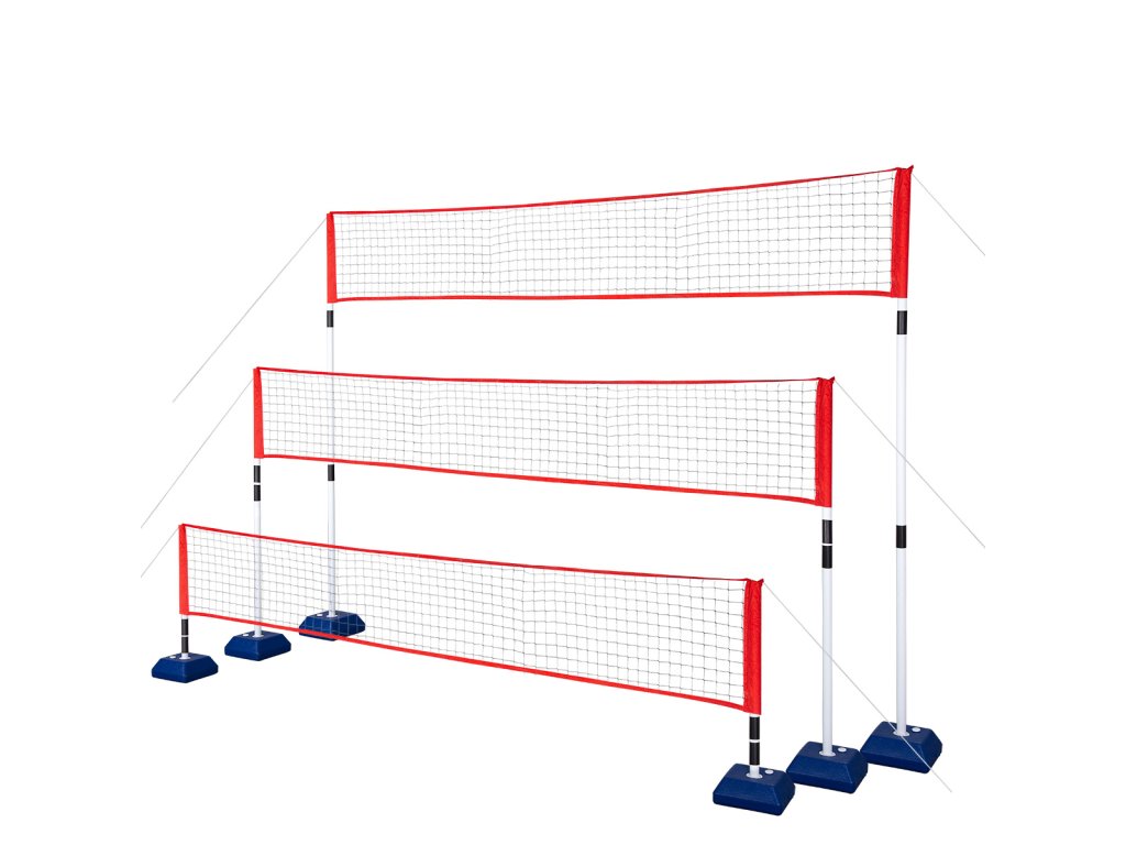 Zestaw z siatką do tenisa, badmintona i siatkówki NILS NT0300 to idealny zestaw do wypełnienia wolnego czasu z dziećmi. W skład zestawu wchodzi siatka o regulowanej wysokości o konstrukcji z tworzywa sztucznego, piłka do siatkówki z pompką, dwie plastikowe rakiety i piankowa piłka tenisowa, dwie plastikowe lotki oraz dwie rakiety do badmintona.