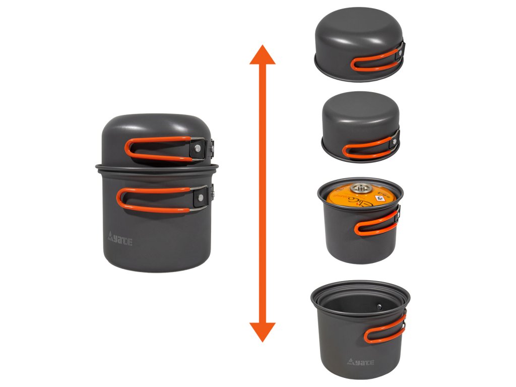 Zestaw naczyń dla 3-4-osobowy wykonany z anodyzowanego aluminium przeznaczonego do kontaktu z żywnością, odpornego na ścieranie. Rękojeści zabezpieczone są silikonem przed poparzeniem i dobrze leżą w dłoni. Dostarczane z opakowaniem transportowym. Bardzo lekki i kompaktowy. W garnku wygodnie mieści się nabój gazowy (300 g w małym garnku, 300 i 500 g w dużym garnku) oraz kuchenka.