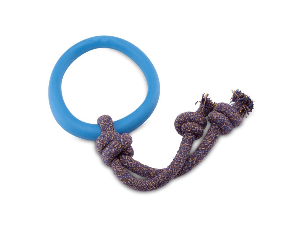 Začnite preťahovanie lanom. Pružná obruč z prírodnej gumy zjemňuje úder, keď váš pes ťahá za jeden koniec. Mäkké lano z recyklovanej bavlny, upevnené hrubými uzlami, vám dáva dobrý úchop. >