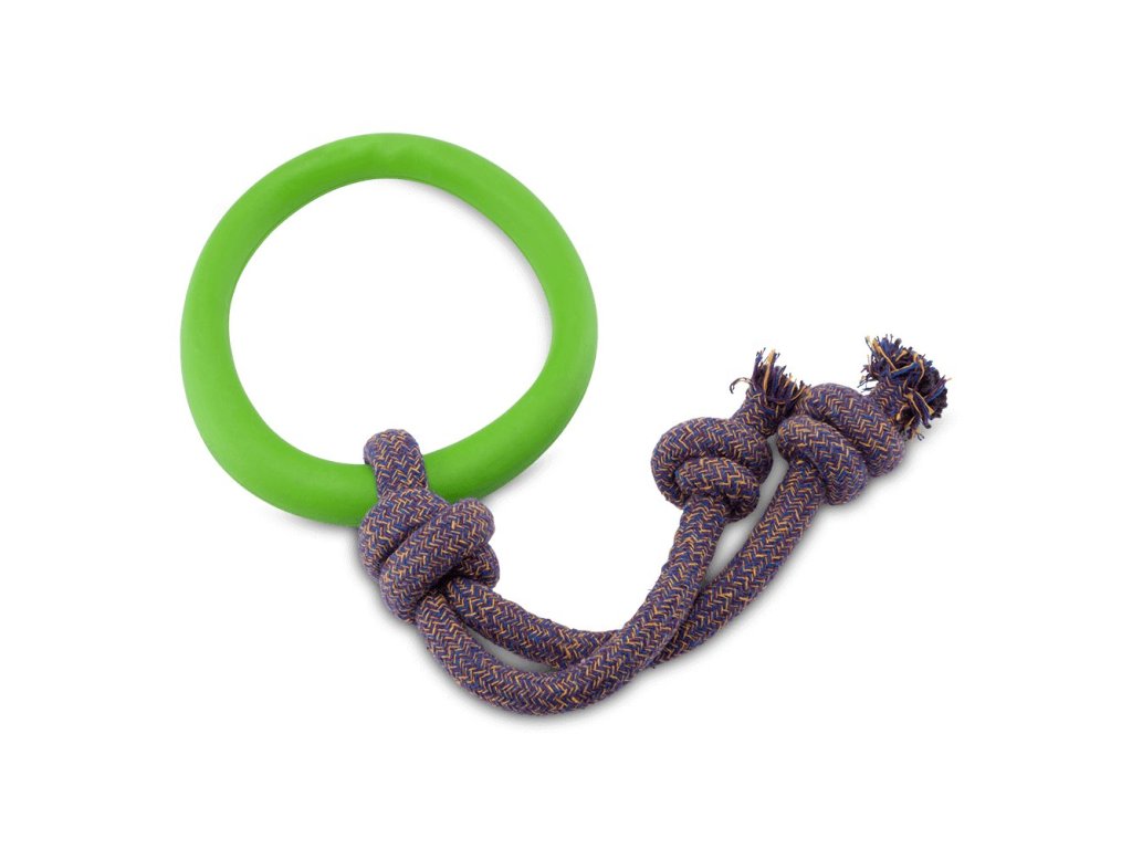 Začnite preťahovanie lanom. Pružná obruč z prírodnej gumy zjemňuje úder, keď váš pes ťahá za jeden koniec. Mäkké lano z recyklovanej bavlny, upevnené hrubými uzlami, vám dáva dobrý úchop. >