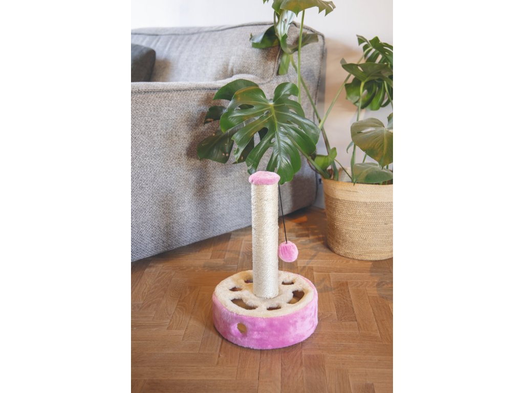 Štýlové škrabadlo pre mačky s odpočívadlom a hračkou.