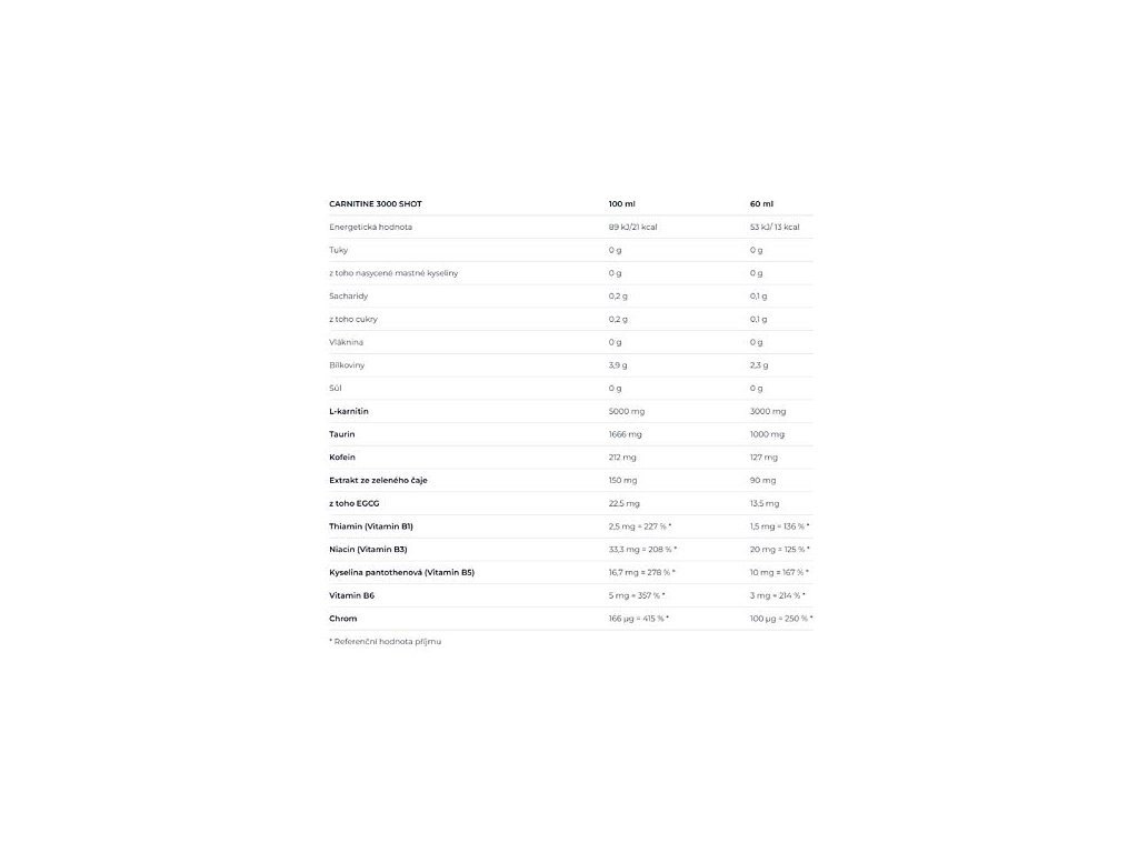 Mimoriadne účinná tekutá zmes vo forme shotu, ktorá v sebe nesie silnú dávku 3 g L-karnitínu, taurín, chróm, ktorý prispieva k normálnemu metabolizmu makroživín, kofeín, extrakt zo zeleného čaju, ktorý pomáha pri kontrole telesnej hmotnosti, ďalej vitamíny B1, B3 , B5 a B6, ktoré prispievajú k zníženiu miery únavy a vyčerpania ak normálnemu energetickému metabolizmu. Carnitin 3000 SHOT pomáha k zlepšeniu stimulácie a koncentrácie, k zlepšeniu vytrvalostného výkonu a ideálne pomáha pri redukcii telesnej hmotnosti. Odporúčané dávkovanie je jeden shot (60 ml). CARNITINE 3000 SHOT je určený na použitie pred dennou aktivitou alebo pred fyzickým výkonom a pre aktívnych jedincov aj pre intenzívne trénujúcich športovcov. - 3000 mg karnitínu v balení (CARNIPURE®) - praktická monodóza - s obsahom kofeínu a taurínu - s extraktom zo zeleného čaju (50 % polyfenolov) - s obsahom chrómu, ktorý prispieva k normálnemu metabolizmu makroživín - obohatené o Vitamín B5 a Vita ktorý prispieva k zníženiu miery únavy a vyčerpania ak normálnemu energetickému metabolizmu - pridaný Tiamín prispieva k normálnej psychickej činnosti - efektívna využiteľnosť organizmom - vhodný pri redukčnom režime aj športovej aktivite Odporúčané dávkovanie: maximálne 1 monodóza (60 ml) denne. Vypite 30 minút pred fyzickým výkonom. Neprekračujte odporúčané dávkovanie. Použitie: určené na priamu konzumáciu alebo zriedenie do športového nápoja. Po otvorení obsah fľaštičky ihneď spotrebujte. Pred použitím pretrepte! Prípadný zákal nie je na závadu výrobku. Zloženie: Príchuť ananás: voda, L-karnitín, taurín, regulátor kyslosti kyselina citrónová, emulzia ananás (aróma, farbivá E 102 a E 110 - môžu nepriaznivo ovplyvňovať činnosť a pozornosť detí), kofeín, extrakt zeleného čaju (50 % polyfenolov, 15 % EGCG – epigalokatechín galátu, 8 % kofeínu), konzervanty sorban draselný a benzoát sodný, nikotínamid, sladidlá acesulfám K a sukralóza, D-pantotenát vápenatý, sladidlo steviol-glykozidy, pyridoxín hydrochlorid, pyridoxín hydrochlorid. Príchuť pomaranč: voda, L-karnitín, taurín, regulátor kyslosti kyselina citrónová, kofeín, extrakt zeleného čaju (50 % polyfenolov, 15 % EGCG – epigalokatechín galátu, 8 % kofeínu), emulzia pomaranč (aróma, farbivá E 104 a E môžu nepriaznivo ovplyvňovať činnosť a pozornosť detí), konzervanty sorban draselný a benzoát sodný, nikotínamid, sladidlá acesulfám K a sukralóza, D-pantotenát vápenatý, sladidlo steviol-glykozidy, pyridoxín hydrochlorid, tiamín hydrochlorid, mliečny. Príchuť jahoda: voda, L-karnitín, taurín, regulátor kyslosti kyselina citrónová, kofeín, extrakt zeleného čaju (50 % polyfenolov, 15 % EGCG – epigalokatechín galátu, 8 % kofeínu), konzervanty sorban draselný a benzoan sodný, nikotina , aróma, sladidlo sukralóza, D-pantotenát vápenatý, sladidlo steviol-glykozidy, pyridoxín hydrochlorid, tiamín hydrochlorid, farbivo E 122 – môže nepriaznivo ovplyvňovať činnosť a pozornosť detí, mliečnan chromitý. Upozornenie: Doplnok stravy, so sladidlami. Obsahuje kofeín (127 mg/60 ml) - nie je vhodný pre deti, tehotné a dojčiace ženy. Nenahrádza pestrú stravu. Ukladajte mimo dosahu detí! Skladujte v suchu pri teplote do 25 ° C mimo dosahu priameho slnečného žiarenia. Chráňte pred mrazom. Výrobca neručí za prípadné škody vzniknuté nevhodným použitím alebo skladovaním.Dodatočné parametre