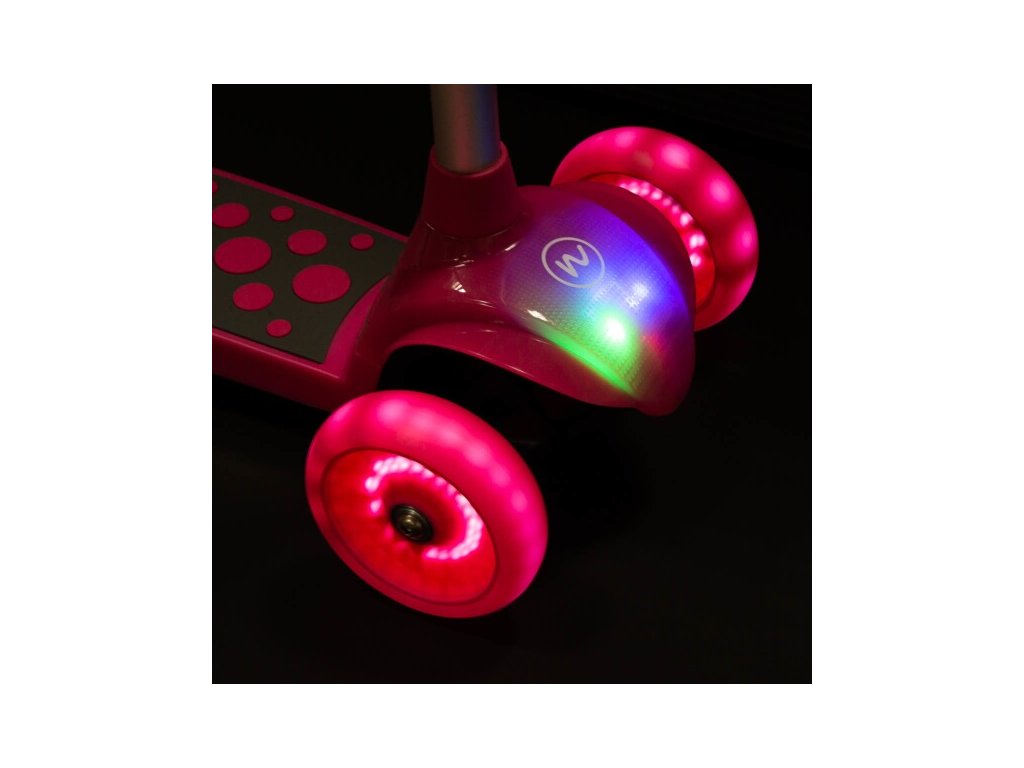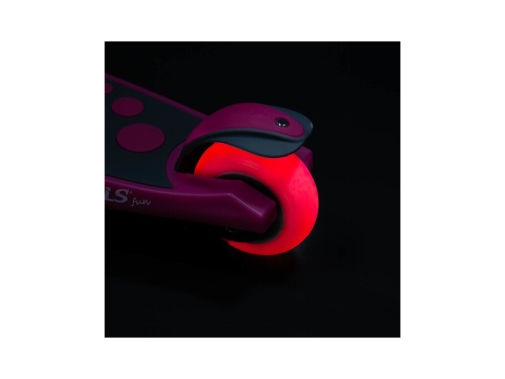 Kolobežka NILS Fun HLB02 má kolieska osadené svietiacimi LED diódami, ktoré slúžia ako zaujímavý, vizuálny prvok, zvyšujú záujem detí av neposlednom rade zvyšujú viditeľnosť kolobežky napríklad za šera . Kolieska svietia automaticky počas ich otáčania.