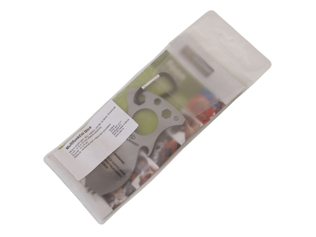 Možno použiť ako: lyžicu, vidličku, otvárač na fľaše, skrutkovač a kľúč 6,8,10 mm vrátane karabínky.