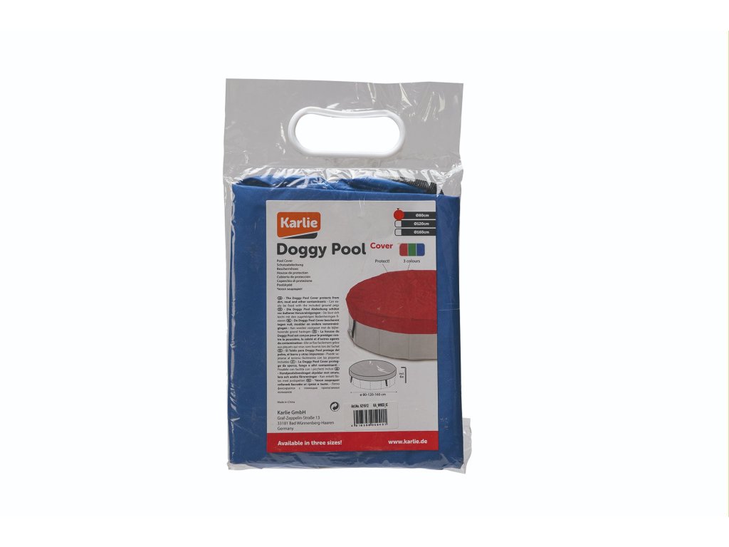 Ochranný kryt na bazén pre psov v modrej farbe. Vhodný na bazény s priemerom 80 cm. Je možné ľahko upevniť pomocou priložených kolíkov.