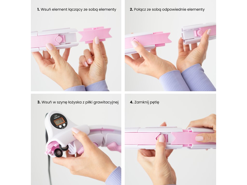 Dĺžka obruče sa nastaví podľa obvodu pása tak, aby bola dostatočne voľná, ale zároveň aby nepadala cez boky. Po nastavení dĺžky sa obruč uzamkne pomocou spojovacieho dielu, ktorý je osadený páčkou na ovládanie zámku. Závažie sa následne „vrhne“ smerom, do ktorého budeme krútiť boky a začneme tréning. Obruč HHW06 je z vnútornej strany vybavená masážnymi výstupkami s pružinami, ktoré tlmia vibrácie od pohybujúcej sa kotvy a zároveň príjemne masírujú oblasť pása. Intenzitu tréningu ovplyvňuje dĺžka povrázku a rýchlosť, akú krútime boky.