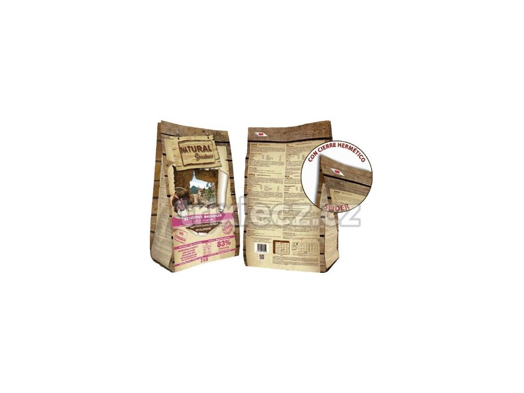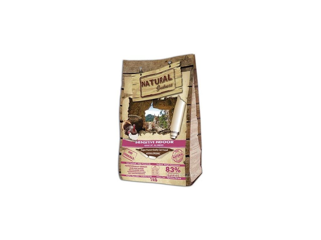 Natural Greatness Sensitive Indoor Catje kompletným kŕmením superprémiovej kvality pre dospelé mačky všetkých plemien.