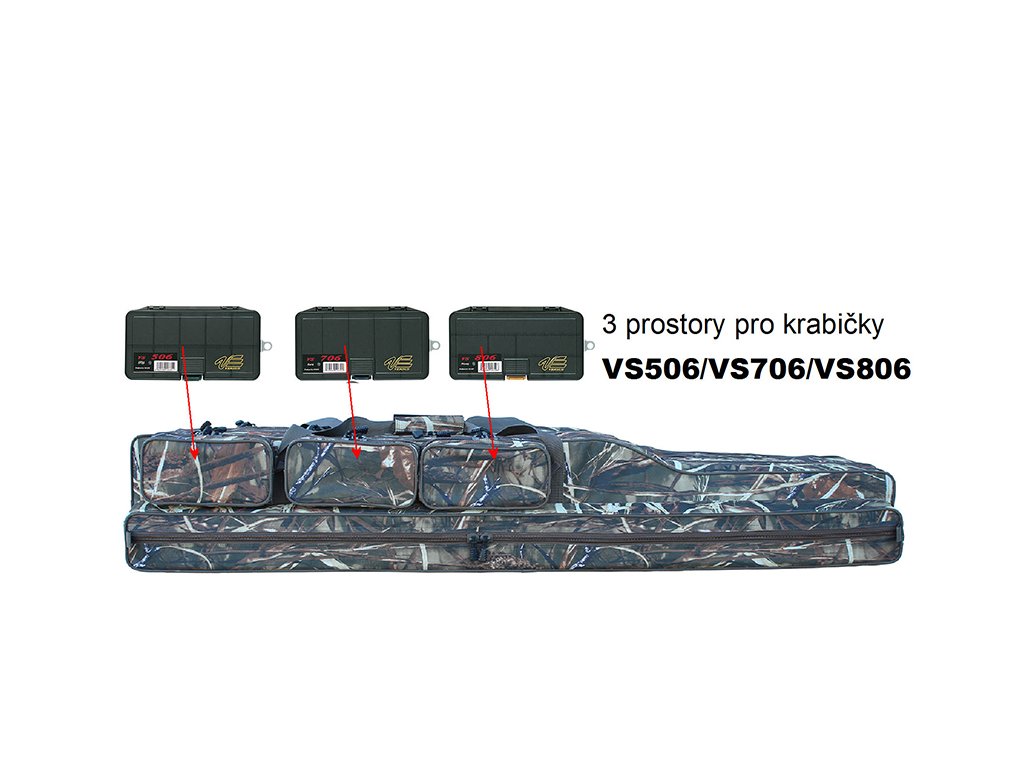 Úplne nový obal na prúty vo vzore camo pojme takmer všetko potrebné na vašu rybársku výpravu. Šírka komory je 11cm, výška 21cm sa v 80cm zužuje na 11cm. To vytvára dostatočný priestor na navijak nasadený na prúte. Na jednej strane je dlhé vrecko po celej dĺžke obalu 95x9x5cm na podberák a nad ňou sú tri vrecká 20x10x5cm na drobnosti, alebo na krabičky Versus typu VS506, VS706 a VS806. Na druhej strane sú tri vrecká o rozmere 20x20x5cm do ktorých pasujú krabičky typu VS3010NDM, VS3010ND a VS3010NS a jedno vrecko nepremokavé na doklady. Na popruhách sú štyri užitočné oká na zavesenie rôznych potrieb. Všade sú použité veľké pevné zipsy s dvoma jazdcami, ktoré majú namiesto kovovej rukoväte povrázok s plastovým gripom. Obal je ušitý z pevného 600D Oxford Nylon materiálu, ktorý je veľmi pevný a odolný.Dodatočné parametre