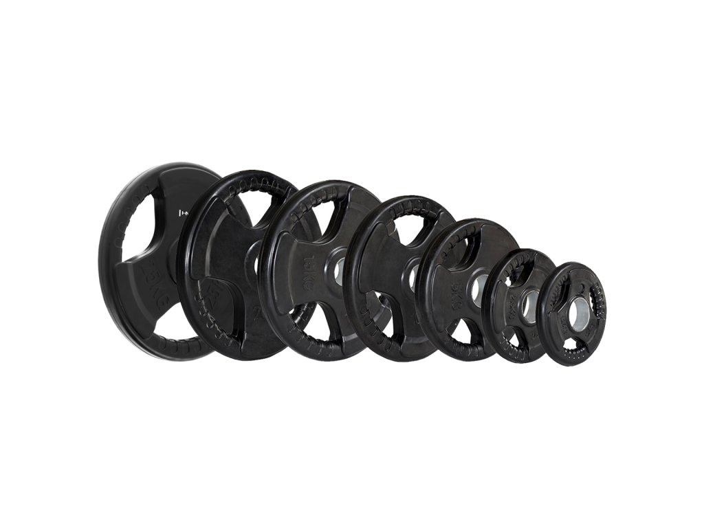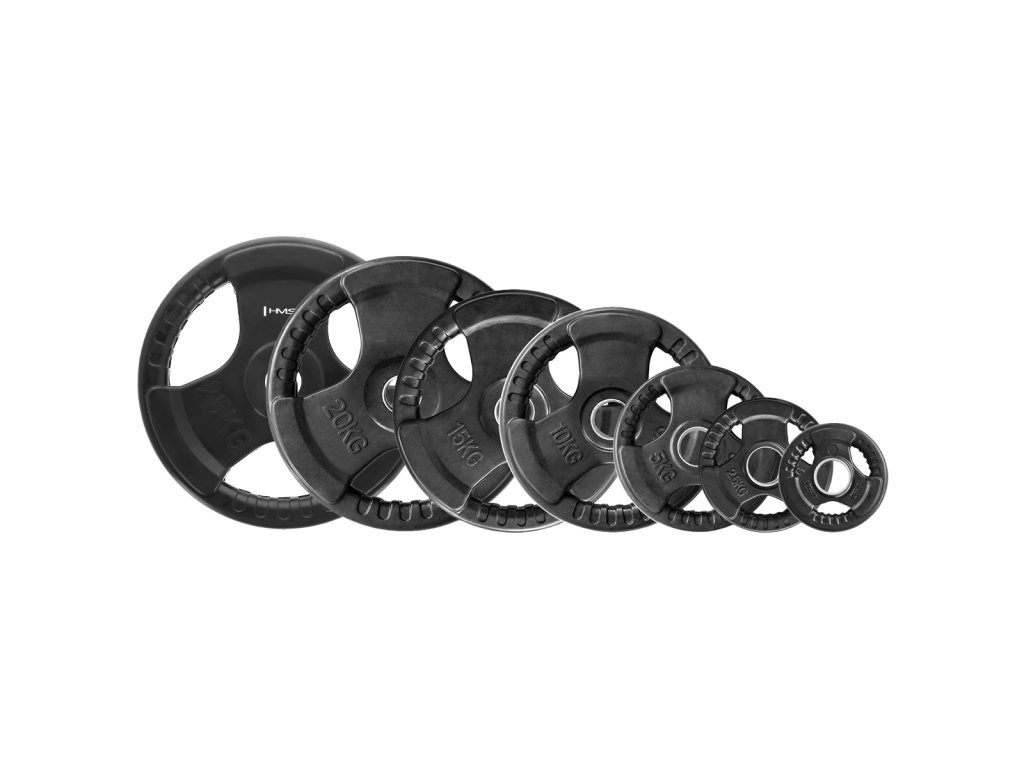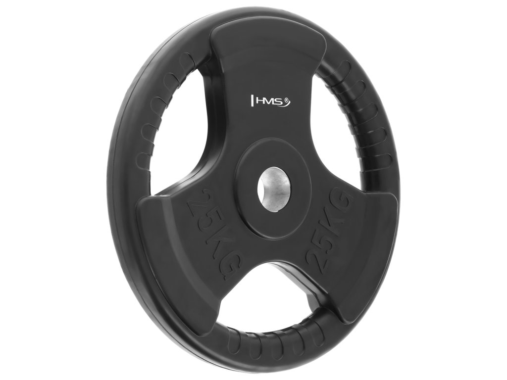 Olympijský, pogumovaný kotúč HMS Tri-grip je známkou kvality a precízneho prevedenia. Tento tanier má otvor s priemerom 50 mm, je teda vhodný pre všetky typy olympijských osí. Závažie disponuje tromi držadlami pre jednoduchú manipuláciu a pogumovaný povrch predlžuje jeho životnosť.