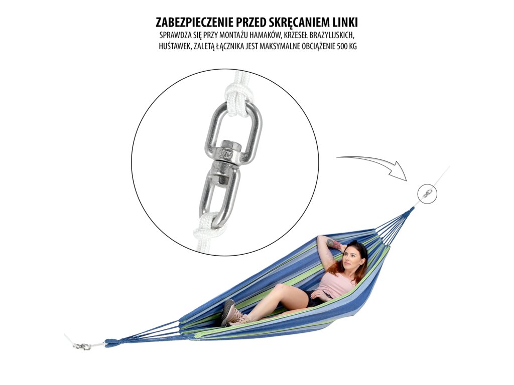 Oceľové, otočné oko NILS Camp NB5041 je určené ako ochrana pred krútením a zamotávaním lán u hojdačiek, hojdacích sietí a brazílskych kresiel počas používania. Nosnosť jedného oka je až 500 kilogramov.