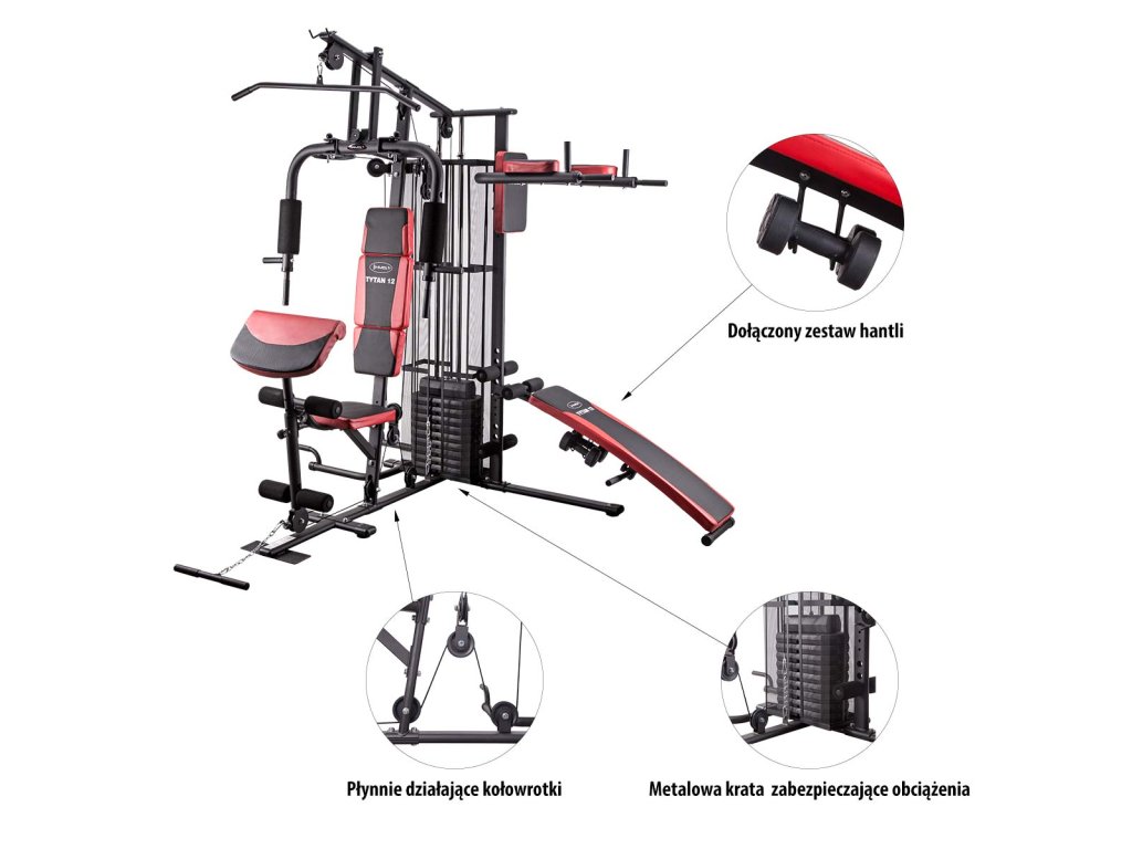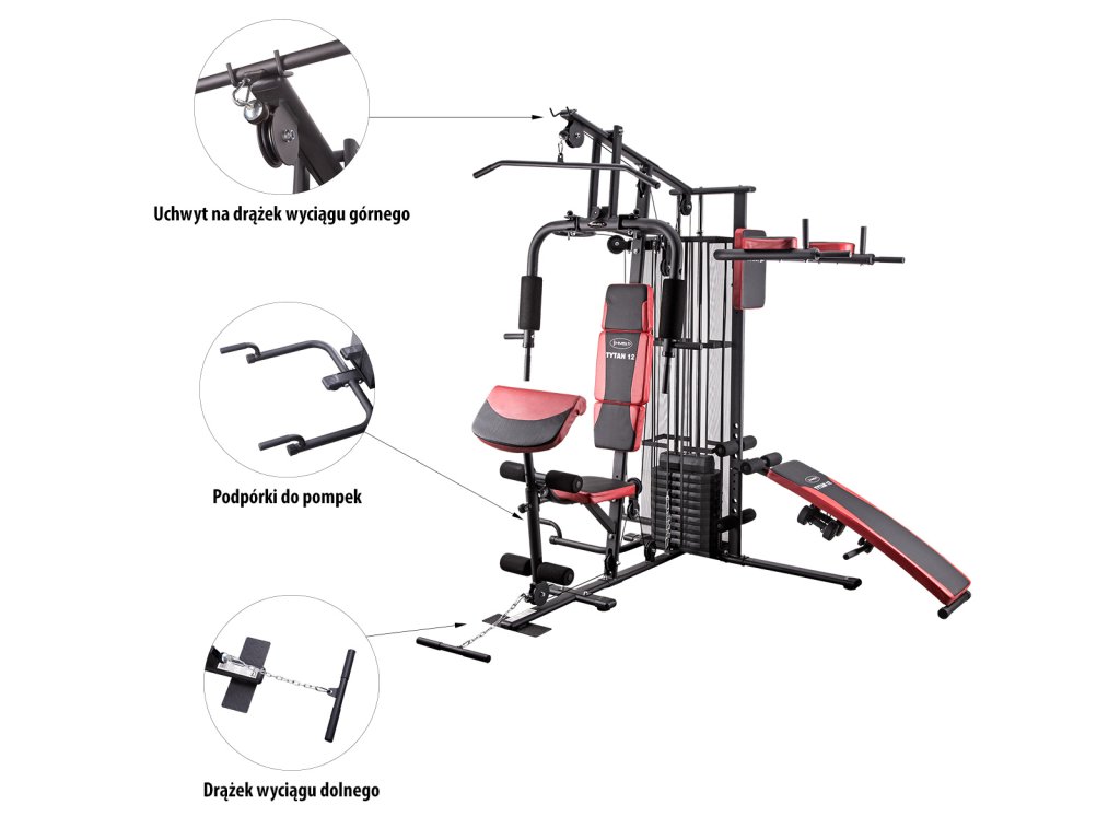 HMS Tytan 12 je moderná, posilňovacia veža pre komplexný silový tréning v domácom prostredí. Základ konštrukcie tvorí sada závaží, ktorá sa skladá z 9-tich tehál s hmotnosťou 7 kilogramov az hornej tehly s hmotnosťou 5 kilogramov, celková hmotnosť závažia teda je 68 kilogramov. Súprava závaží je pre maximálne bezpečie krytá drôtenou klietkou. Záťaž je pomocou sady kladiek s ložiskami a oceľových lán rozvádzaná k jednotlivým aktívnym prvkom:
