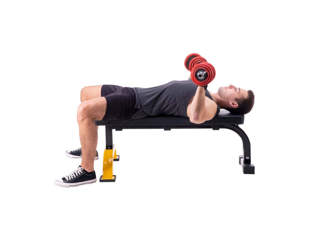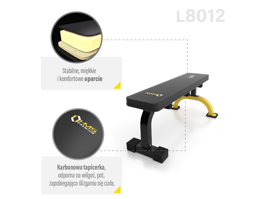 Rovná lavica HMS Premium L8012 je ideálna pre všetky základné cviky s činkami, osami či vlastnou váhou. Robustná konštrukcia dokáže uniesť až 200 kg záťaže a pohodlná, vysoko polstrovaná opierka zaručí pohodlný tréning. Jeden stabilizátor je rozšírený pre vysokú stabilitu a istotu pri tréningu aj s veľkými váhami.