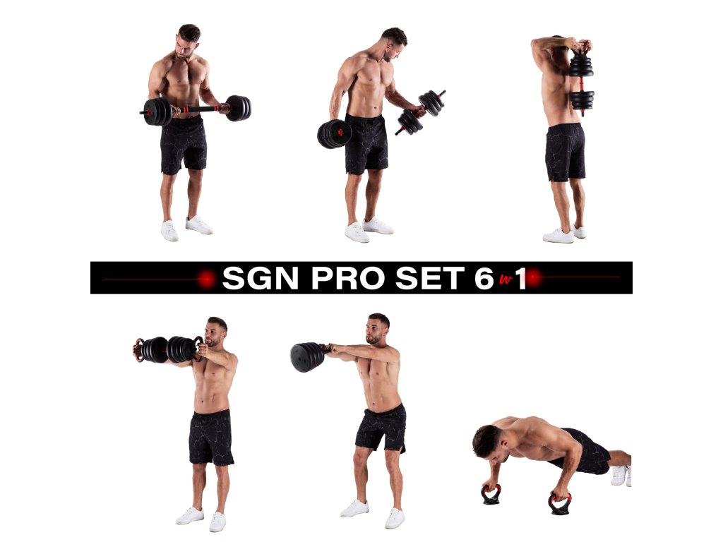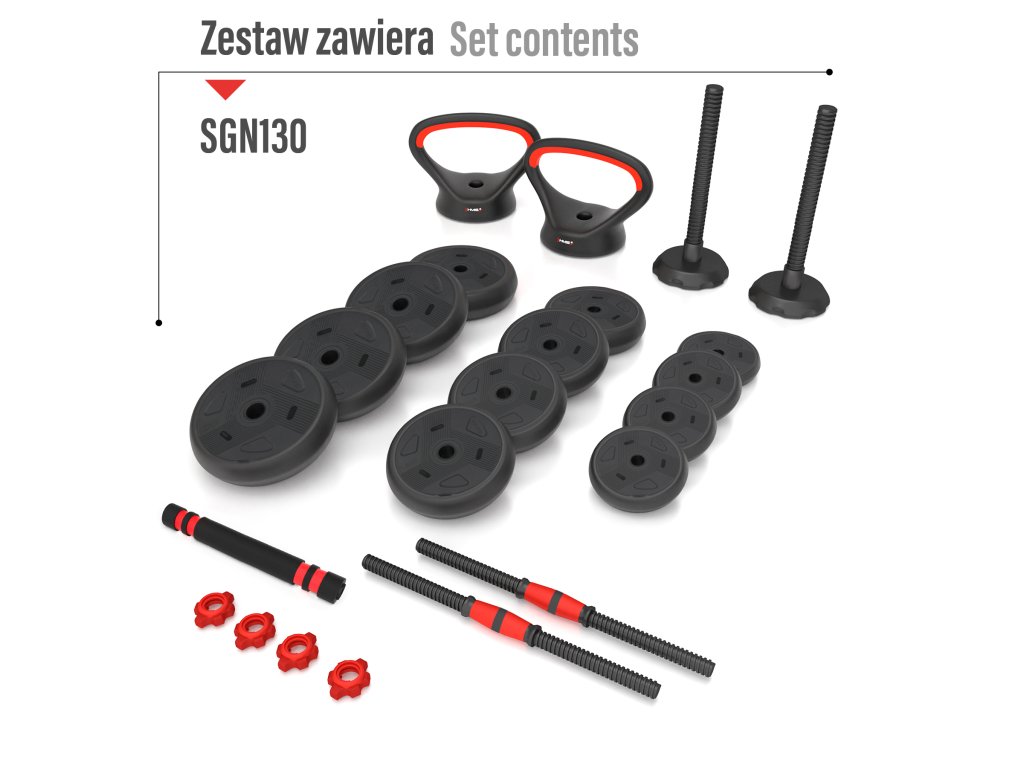 HMS SGN130 6v1 je variabilná a všestranná sada nakladacích činiek, ktorá umožňuje vykonávať širokú škálu silových cvičení s jednou sadou. Sada SGN130 6v1 sa skladá zo 16-tich kotúčov, dvoch krátkych osí, jedného spojovacieho dielu, dvoch úchopov a dvoch nakladacích tŕňov pre kettlebell a uzáverov. Kombinovaním jednotlivých dielov môžete vytvoriť vždy jednu z nasledujúcich 6-tich zostáv.
