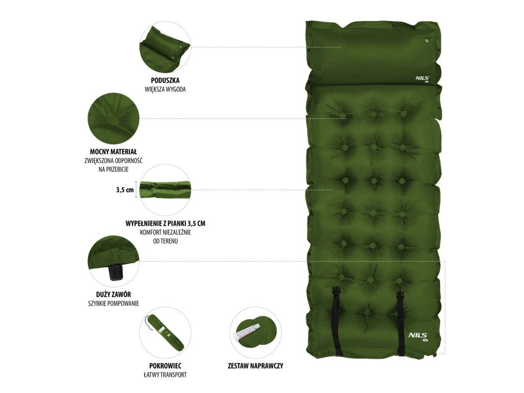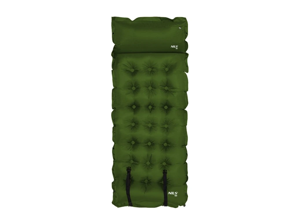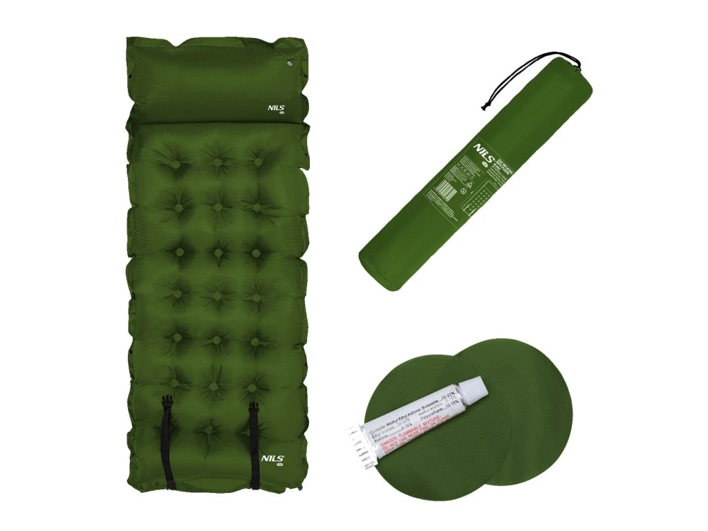 Samonafukovacia karimatka NILS CAMP NC4018 zaistí kvalitný spánok počas kempovania a dovoleniek pod stanom. Podložka je ale vhodná aj k vode a všade tam, kde si chcete príjemne poležať. Samonafúknutie zaisťuje vnútorný, penový materiál s otvorenými pórmi. Po povolení ventilu do seba nasáva vzduch a dostáva sa tak do pôvodného stavu. Záverom je ešte potrebné podložku dofúknuť na požadovanú tvrdosť. Skladanie sa vykonáva otvorením ventilu a zrolovaním od opačnej strany, než je ventil. Karimatku potom zaistíme remienkami s prackami a vložíme do dodávaného vaku. Na model NC4018 bol použitý veľmi odolný polyester 190T potiahnutý vrstvou PVC, táto kombinácia zaisťuje vysokú odolnosť a karimatka sa dá položiť aj na nerovný povrch. Lemy karimatky sú opatrené cvočkami, ktoré umožňujú spojiť viac matracov do jednej, veľkej plochy, toto sa hodí napríklad na vyplnenie podlahy v stane. Vankúšik nie je odnímateľný a oproti karimatke nie je vyplnený penou a je potrebné ho celý nafúknuť. Súčasťou balenia je aj opravná sada, ktorá sa hodí v prípade poškodenia.