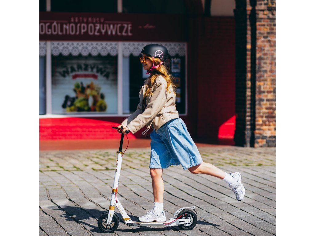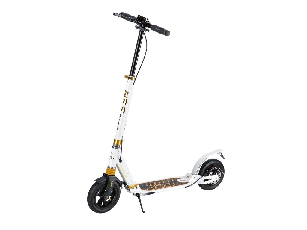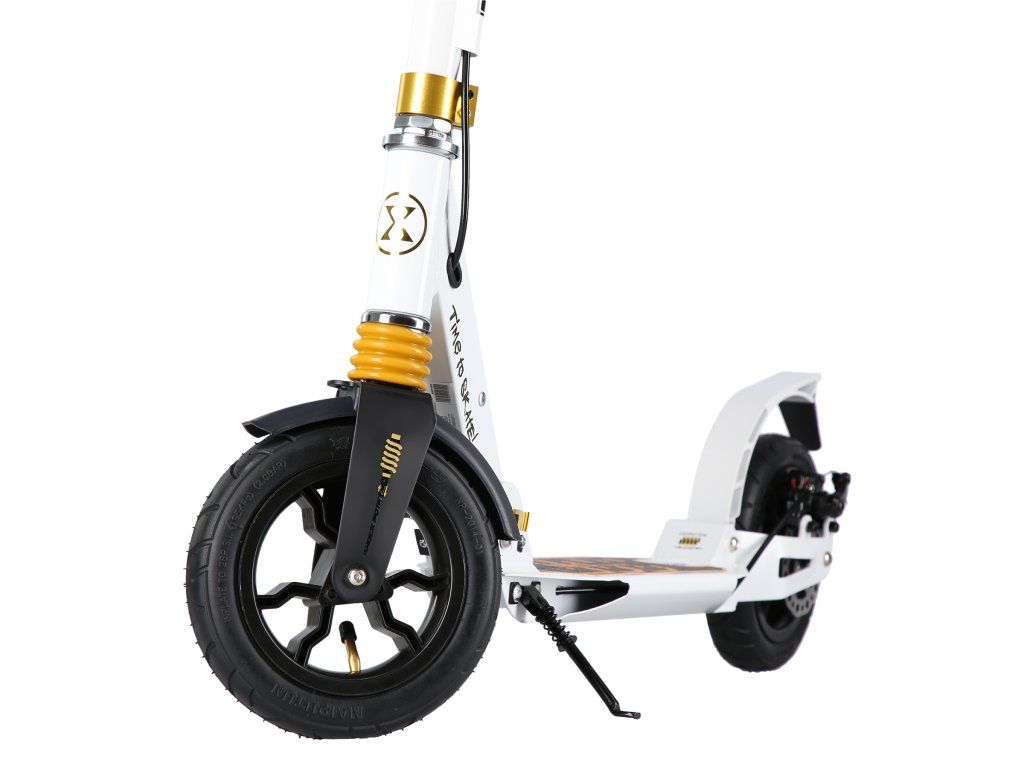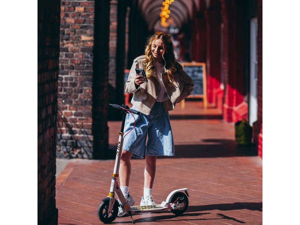 S kolobežkou HM209T máte cestovný komfort na dosah ruky. Rýchle ložiská ABEC9 zaručujú hladkú jazdu a výnimočnú odolnosť, zatiaľ čo nafukovacie kolesá s priemerom 200 mm zaistia, že každá cesta bude plynulá a príjemná. Kolobežka je tiež vybavená predným aj zadným tlmičom, čo je v tejto kategórii výrobkov jedinečné a stojí za jej výnimočným komfortom jazdy bez ohľadu na nerovnosti terénu. Nastaviteľné riadidlá umožňujú prispôsobiť kolobežku výške užívateľa a ponúkajú ideálnu ergonómiu. Gripy sú gumové s ergonomickým tvarom pre istý a pevný úchop.