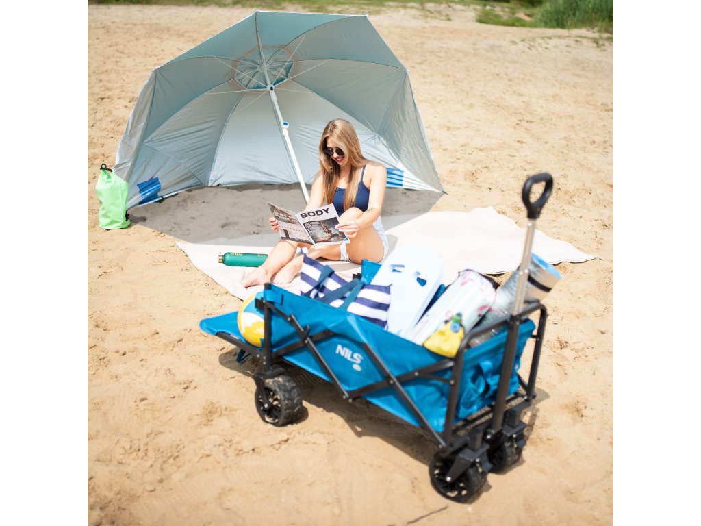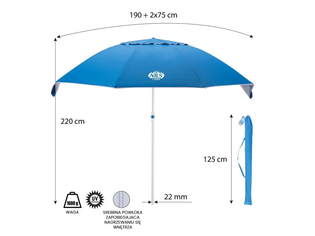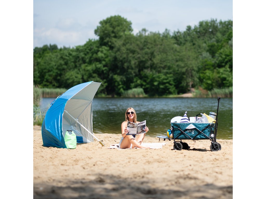 Plážový slnečník s možnosťou použitia ako plážová zástena, to je NILS Camp NC7822. Slnečník je ideálnym parťákom počas slnečného popoludnia na pláži alebo na záhrade. NC7822 sa ľahko prenáša vďaka dodávanému vaku s pútkom cez rameno. Spodná tyč je osadená špičkou pre ľahké zapichnutie do podkladu. Polyesterová plachta má priemer 190 centimetrov a dokonale chráni pred slnečným svitom a škodlivým UV žiarením. Na 2 protiľahlých stranách sa nachádzajú bočnice so šírkou 75 centimetrov, ktoré sa použijú pri položení slnečníka na podklad a slúžia ako okraje plážovej zásteny, tá sa zaistí k podkladu pomocou 4 dodávaných kolíkov. Pokiaľ NC7822 používame ako slnečník, môžeme bočnice pomocou plastových karabínok pripnúť k vrchlíku, aby nám neprekážali.
