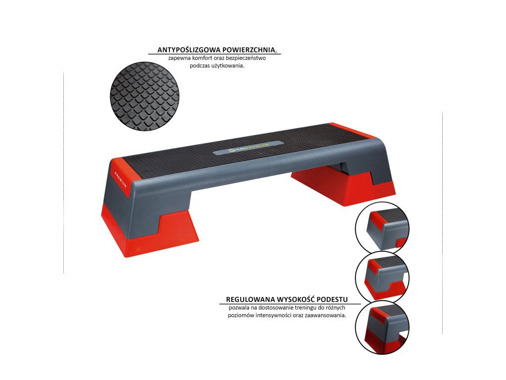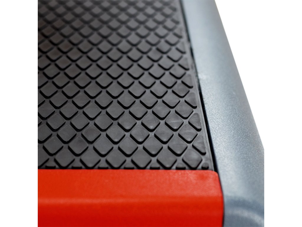 Step je vybaven protiskluzovým povrchem, který zajišťuje jistý pohyb i při dynamickém cvičení. Gumové nožičky zabraňují posunování stepu a zaručují stabilitu a bezpečnost.