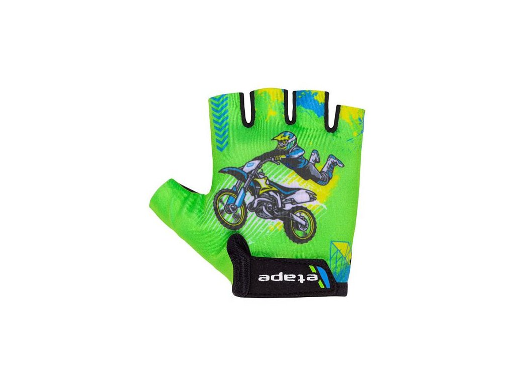 Cyklistické rukavice patří do základního vybavení každého správného cyklisty. Jednak při pádu chrání dlaně proti odření, zvyšují celkový komfort při jízdě a slouží zároveň i jako módní doplněk k vašemu cyklistickému oblečení. Dětské cyklistické rukavice Etape Tiny s roztomilým designem mají anatomické prošití dlaně, protiskluzovou úpravu a jednoduché zapínání na suchý zip. Model Tiny se vyrábí v několika barevných provedeních tak, aby ladil k dětským cyklistickým helmám značky Etape. Dle výrobce velikost rukavic odpovídá přibližně věku dítěte.Doplňkové parametry