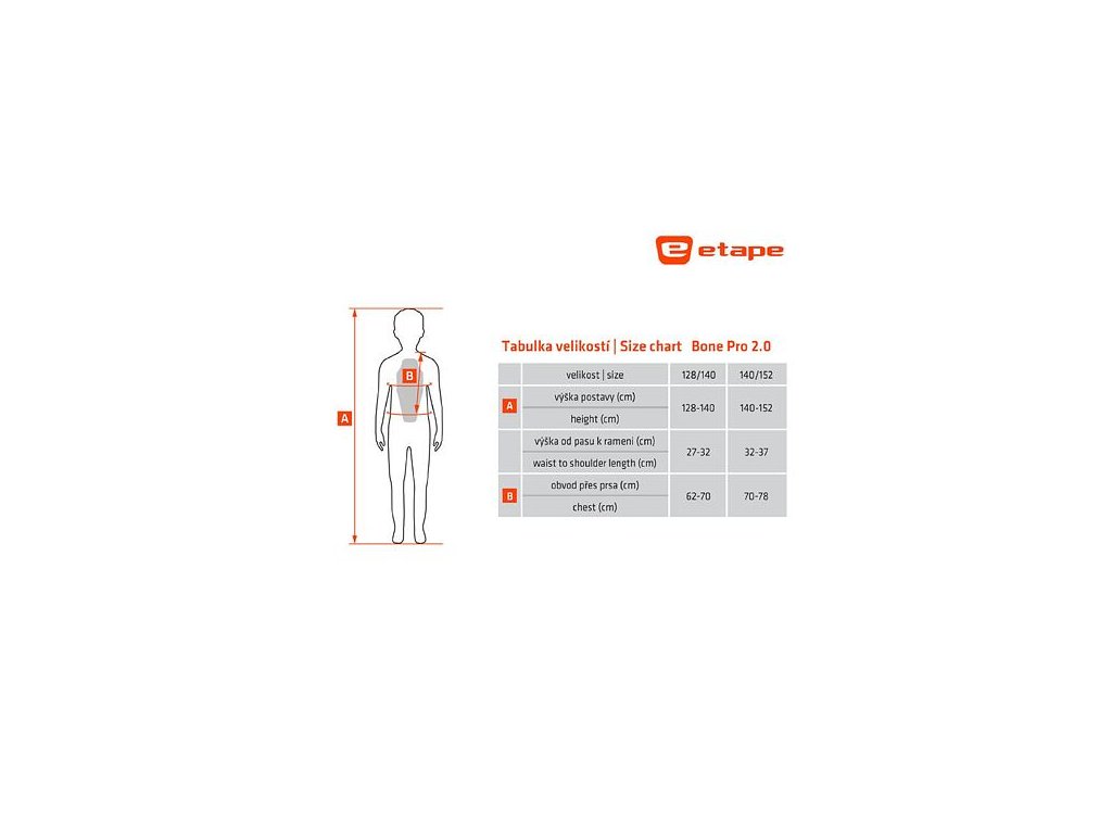 Thiết bị bảo vệ cột sống trẻ em ETAPE Bone Pro 2.0 thích ứng hoàn hảo với cơ thể và do đó đảm bảo sự thoải mái và an toàn tối đa cho tất cả những người hâm mộ các môn thể thao mùa đông đang tìm kiếm sự bảo vệ chất lượng đồng thời nhấn mạnh đến sự thoải mái. Sự chấp thuận theo tiêu chuẩn Châu Âu EN 1621-2 là sự đảm bảo cho việc đảm bảo an toàn. Sự bảo vệ và thoải mái tối đa được mang lại bởi bọt thấm FOAMFLEX 3DTM. Sự kết hợp giữa chất liệu Lycra và lưới đàn hồi mang lại khả năng thông gió tối ưu. Bạn có thể giặt riêng áo vest nhờ lớp bọt thấm hút có thể tháo rời. Bone PRO 2.0: - được phê duyệt theo tiêu chuẩn ČSN EN 1621-2, loại 1 - Bọt thấm FOAMFLEX 3DTM để bảo vệ và thoải mái tối đa - sự kết hợp giữa chất liệu Lycra và lưới đàn hồi để thông gió và thoải mái tối ưu - Xử lý silicon chống trượt ở eo - co giãn có thể điều chỉnh Thắt lưng bằng khóa dán Velcro SafeTM = bảo vệ quần áo 100% - có thể tháo bọt thấm và giặt áo. Kích thước tương ứng với chiều cao của dáng người. Các giá trị đã cho chỉ mang tính biểu thị và tùy theo hình ảnh cụ thể, kích thước phù hợp có thể khác nhau. Chất liệu: 40% polyurethane, 35% polyester, 25% polyamide Bảo quản: giặt tay trong nước lạnh, phơi khô, không sấy khô, không dùng nước xả vải, không tẩy, không ủi, không giặt khô.Các thông số bổ sung