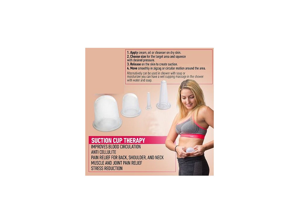 Bình mát xa bằng silicon là trợ thủ đắc lực và nhanh chóng để mát xa toàn bộ cơ thể. Bình hoạt động trên hệ thống chân không có thể nâng da và mô lên, từ đó đẩy nhanh quá trình tái tạo. Bình thích hợp để loại bỏ cơn đau do cứng cơ, giảm cellulite hoặc cải thiện lưu lượng bạch huyết. Làm sạch da thật kỹ trước khi sử dụng. Chúng tôi khuyên bạn nên thoa kem hoặc gel massage để giữ ẩm cho da vùng được massage. Khi sử dụng, lưu ý không massage một chỗ quá lâu. Sử dụng công cụ massage này một cách nhẹ nhàng và không cố gắng dùng lực quá mạnh. Làm sạch và khử trùng bình thường xuyên để tránh tổn thương da hoặc phồng rộp. Bộ 4 cốc chứa bốn cốc khác nhau: - 1) chiều cao x đường kính đáy: 8 x 7 cm - 2) chiều cao x đường kính đáy: 5,5 x 5,5 cm - 3) chiều cao x đường kính đáy: 8 x 3,7 cm - 4) chiều cao x đường kính đáy : 5 x 1,5 cm - trọng lượng bộ: khoảng 140 g - giá hiển thị cho 1 bộCác thông số bổ sung