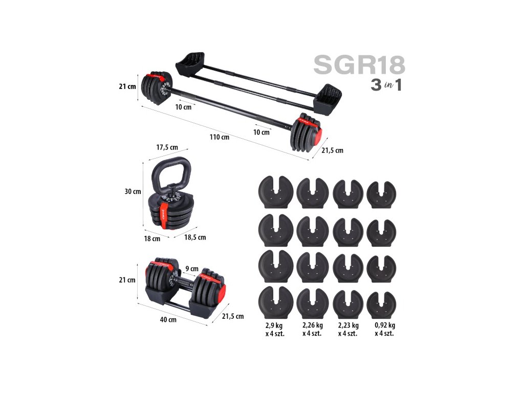 Quả tạ SGR18 có hình dáng tiện dụng và tay cầm chống trượt đảm bảo sự thoải mái và ổn định. Quả tạ có thể được lắp ráp thành tạ một tay, tạ hai tay hoặc tạ ấm. Với mục đích này, bạn sẽ tìm thấy trong gói một bộ phận mở rộng (tay cầm bằng hai tay) có chiều dài 80 cm, có thể đổi lấy tay cầm bằng một tay và 2 thanh để mở rộng đế. Bộ sản phẩm này còn bao gồm 2 tay cầm để sử dụng tạ làm tạ ấm.