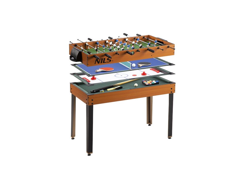 Bàn chơi game đa chức năng NILS SDM 4 trong 1, chứa các trò chơi phổ biến nhất như - bóng đá, bida, khúc côn cầu trên không và bóng bàn. Tất cả điều này ở cùng một nơi chỉ với việc thay thế bảng trò chơi đơn giản. Mẫu này được làm bằng gỗ MDF chất lượng cao, có khả năng chống lại mọi hư hỏng. Cả 4 trò chơi đều có phụ kiện đi kèm.
