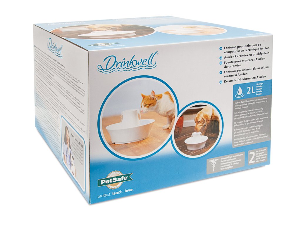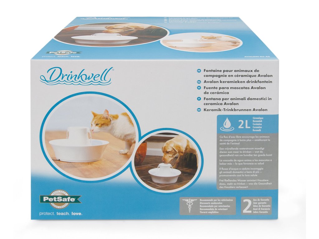 Đài phun nước Drinkwell® Avalon đầy phong cách sử dụng hệ thống dòng nước rơi tự do đã được chứng minh và được cấp bằng sáng chế. Nó phù hợp cho chó và mèo ở mọi kích cỡ, thậm chí cho nhiều vật nuôi cùng một lúc. Bộ lọc có thể thay thế đảm bảo nước sạch, trong lành và thơm ngon. Nhờ chất liệu được sử dụng nên đài phun nước rất ổn định. Bạn chắc chắn sẽ đánh giá cao tính dễ bảo trì, ngoài máy bơm, đài phun nước có thể được rửa trong máy rửa bát.