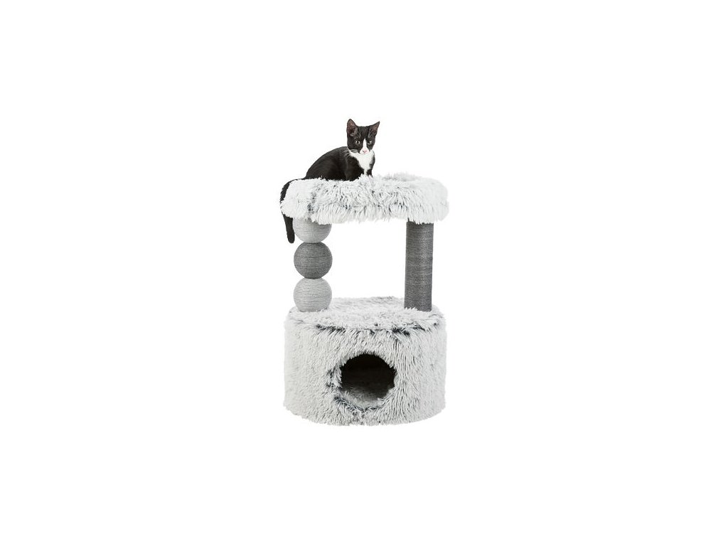 Trụ cào móng cho mèo bao gồm một trụ và một quả bóng lông gắn trên dây.