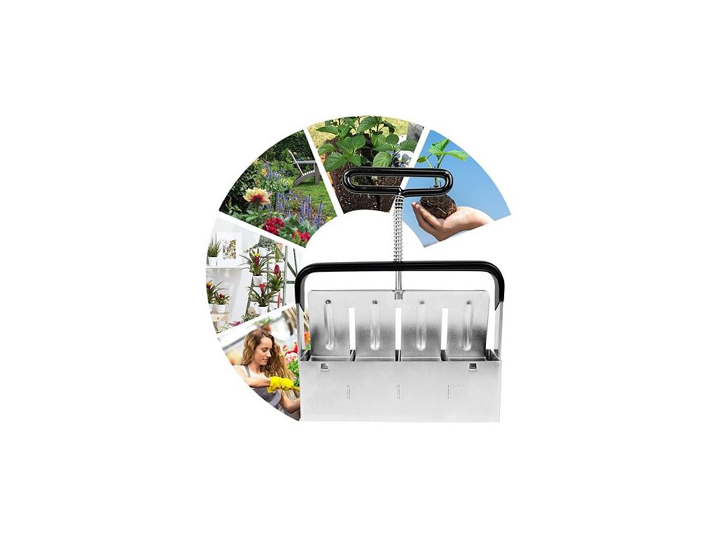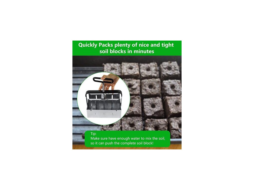 Dụng cụ cầm tay Soil Blocker làm bằng thép mạ kẽm và có tay cầm chống trượt được sử dụng để cắt các khối đất nén, dùng để trồng cây và cấy ghép. Bộ chặn đất sẽ tạo ra một hàng gồm 4 khối đất có chiều cao 2" (khoảng 5,1 x 5,1 cm) và cao 2,4" (khoảng 6,1 cm). Giải pháp này mang tính sinh thái vì không cần sử dụng hộp nhựa đựng cây con, đồng thời hiệu quả hơn. Trong các khối đất, khả năng ra rễ và thắt nút của cây giảm đi do không khí lưu chuyển giữa các khối và cái gọi là "cắt" rễ khi chúng chạm tới mép của khối. Nhờ rễ được cung cấp oxy, cây con sẽ khỏe mạnh hơn và giảm sốc khi cấy ghép. Sử dụng công cụ Soil Blocker: 1.Đặt phần trên của dụng cụ có lò xo vào lỗ trên tay cầm và vặn chặt vào phần kim loại phía trên hình chữ L 2.Chuẩn bị nền đất chất lượng tốt. 3. Ấn chặt toàn bộ dụng cụ vào đất hết mức có thể. 4.Đặt tấm chặn đất cùng với chất nền đất đã nén lên tấm thảm. 5.Giữ tay cầm phía trên, ấn phần trên bằng lò xo và nhấc thanh chắn đất lên, đây là cách bạn đẩy các khối đất ra khỏi dụng cụ lên tấm đệm. Thông số: -kích thước không có phần trên có lò xo: L x W x H: 19 x 5,1 x 14,5 cm -chiều cao của phần có lò xo: 10 cm -tổng trọng lượng: 900 g -kích thước của một khối đất ép đùn: khoảng 5,1 x 5,1 x 6,1 cmCác thông số bổ sung
