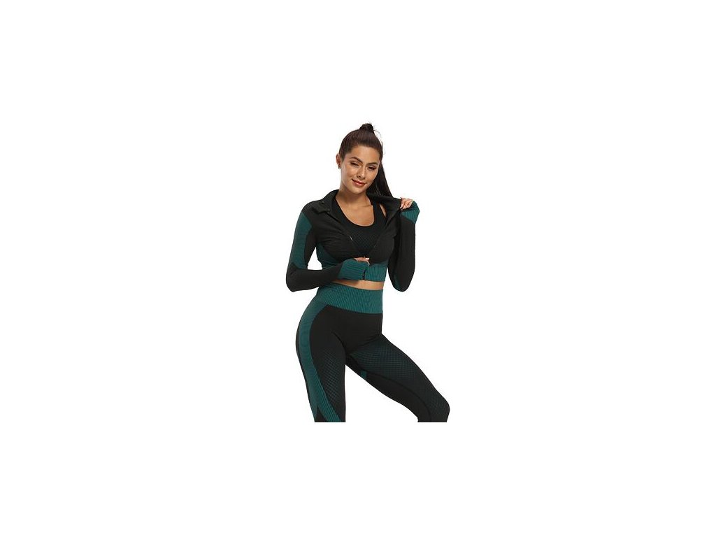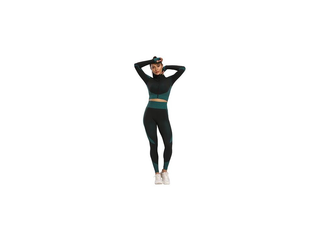 Bộ trang phục thể thao Yoga Sense dành cho nữ gồm ba món - áo lót thể thao, áo nỉ ngắn cổ đứng, có khóa kéo và quần legging dài. Áo ngực có dây đai khoét ở phía sau và cúp áo có thể tháo rời. Áo nỉ phong cách crop top có tay áo dài có lỗ xỏ ngón tay cái. Toàn bộ bộ quần áo được làm bằng vải với công nghệ đặc biệt, có thể tạo hình những đường cong ở một mức độ nhất định với hoa văn của nó. Mỗi phần được bổ sung bởi các chi tiết có màu tương phản. Bạn có thể sử dụng trang phục thể thao cho hầu hết các hoạt động thể thao, từ tập gym, chạy bộ cho đến yoga hay pilates. Thành phần: 90% polyamit, 10% polyester. Giặt ở nhiệt độ tối đa 30°C với các đồ có màu tương tự. Size S: Áo ngực ngang ngực: 36 cm, dưới ngực: 30, chiều dài: 35 cm Chiều dài áo: 41 cm, chiều rộng ngực: 32 cm, chiều rộng vai: 34 cm Chiều dài quần legging: 85 cm, chiều rộng eo: 30 cm, chiều rộng hông: 33 cm Size M: Áo ngực ngang ngực: 38 cm, dưới ngực: 32 cm, chiều dài: 36 cm Chiều dài áo: 41 cm, chiều rộng ngực: 34 cm, chiều rộng vai: 37 cm Chiều dài quần legging: 90 cm, Chiều rộng vòng eo: 32 cm, chiều rộng hông: 36 cm Size L: Áo ngực ngang ngực: 40 cm, dưới ngực: 34 cm, chiều dài: 37 cm Chiều dài áo: 43 cm, chiều rộng ngực: 37 cm, chiều rộng vai: 39 cm Chiều dài quần legging: 92 cm, chiều rộng eo: 33 cm, chiều rộng hông: 38 cmCác thông số bổ sung