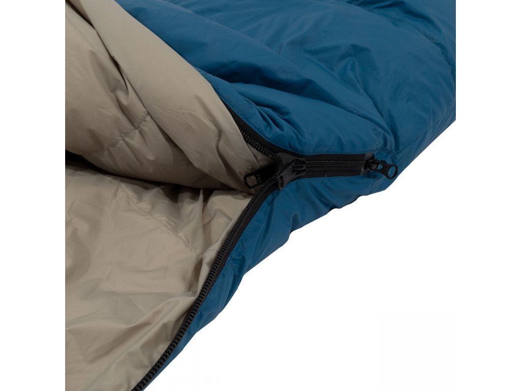 Zapínání: spacák je vybaven značkovým zipem YKK se speciálním plastovým chráničem, který zabraňuje vniknutí látky do jezdce a samovolnému rozepínání. U hlavy je zip ještě zajištěn klopou na suchý zip, která zamezuje samovolnému otevření zipu.